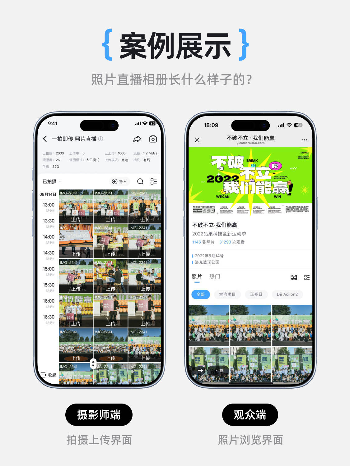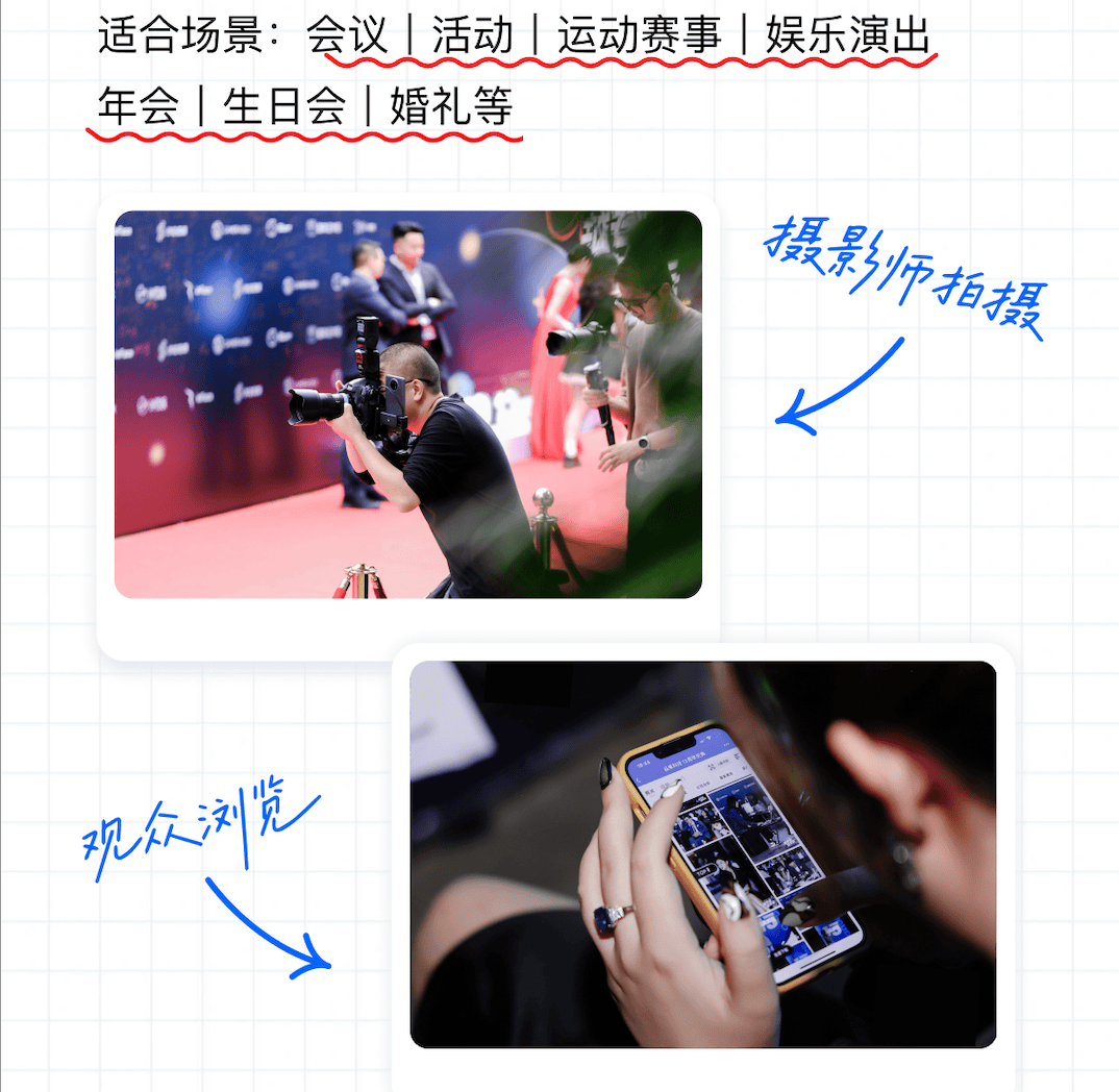 ●通过扫码进入及时相册,社交和现场大屏,对于从办方而言,●对摄影师而言,